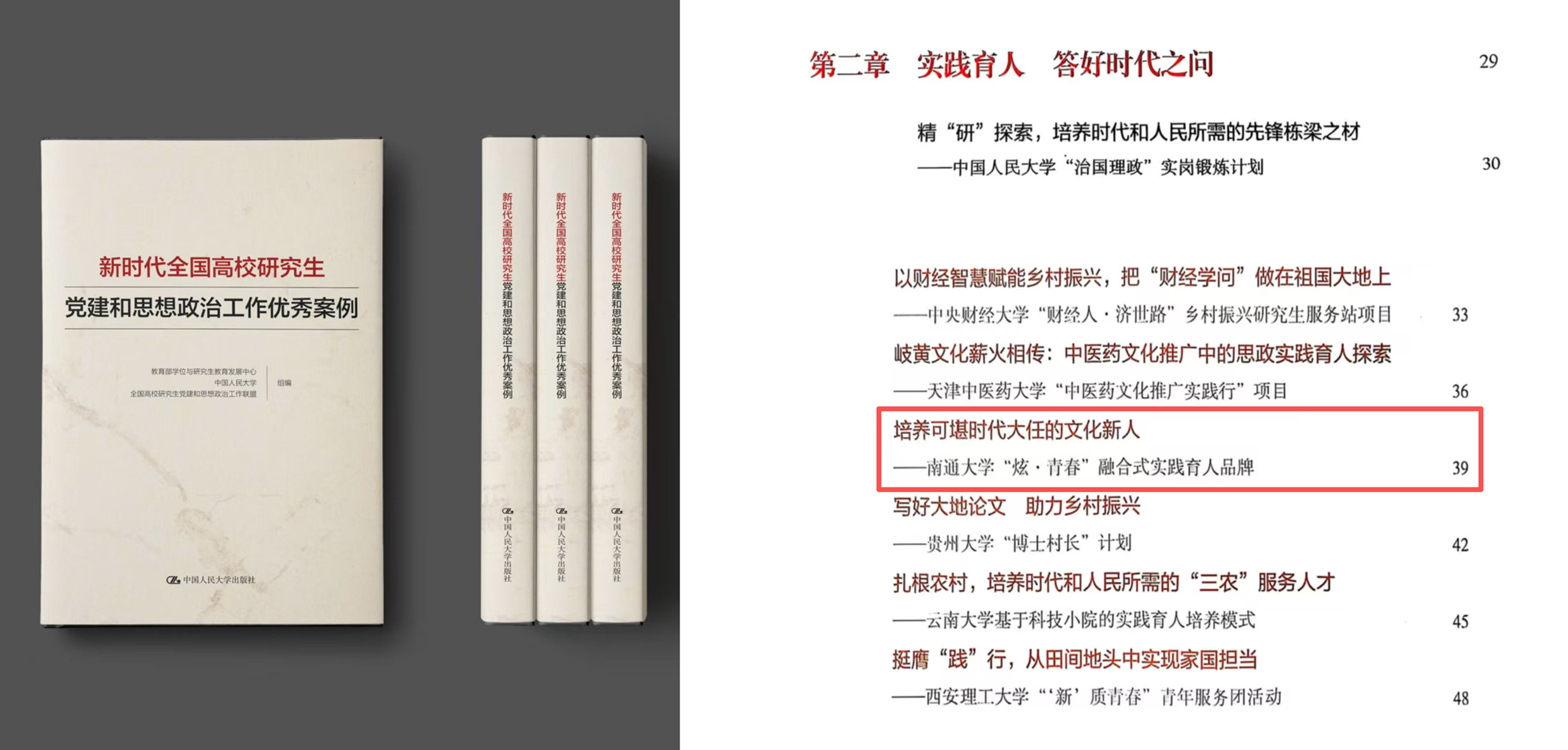 近日,由教育部学位与研究生教育发展中心指导,与中国人民大学、全国高校研究生党建和思想政治工作联盟联合组编的《新时代全国高校研究生党建和思想政治工作优秀案例》一书正式出版。我校报送的案例《培养可堪时代大任的文化新人——南通大学“炫·青春”融合式实践育人品牌》成功入选,成为全国42项优秀典型案例之一。