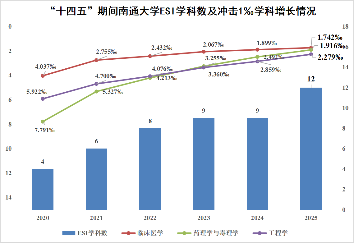 “十四五”期间南通大学ESI学科数及冲击1‰学科增长情况