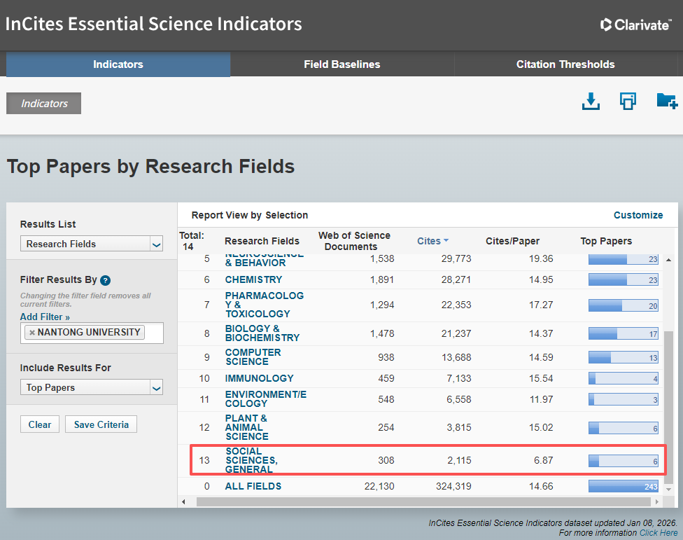 1月8日,国际性第三方评价机构科睿唯安发布了2026年1月期ESI数据,我校社会科学学科进入ESI全球排名前1%学科行列,实现了我校在人文社科领域学科零的突破。至此,我校ESI全球前1%学科总数增至13个,学校国际学术影响力与核心竞争力持续提升。数据显示,社会科学学科现被收录ESI论文308篇,累计被引频次2115次,篇均被引频次6.87次,高水平论文6篇。